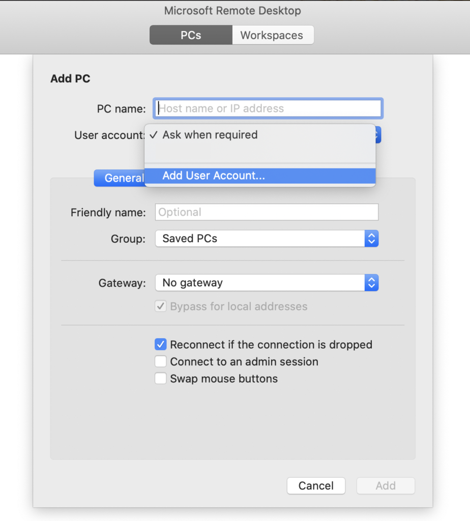 - Wähle unter dem Reiter „User Account“ dann „Add User Account…“ aus und gebe deinen Username und das Passwort ein.