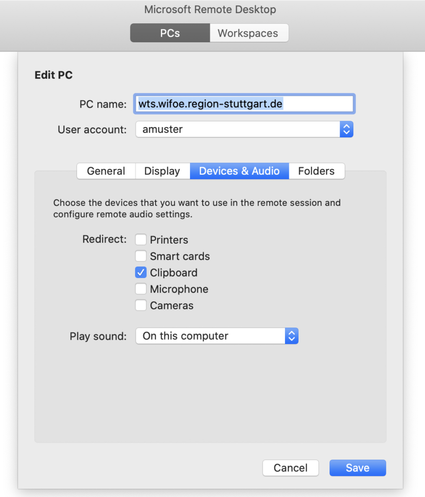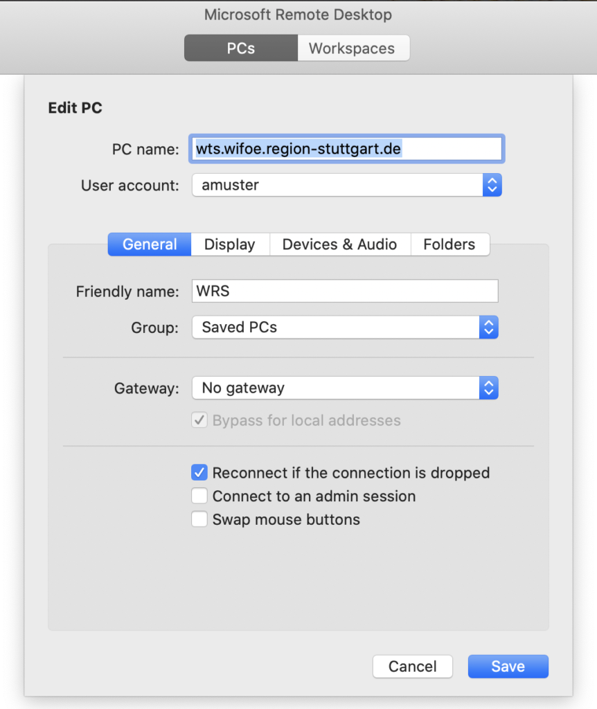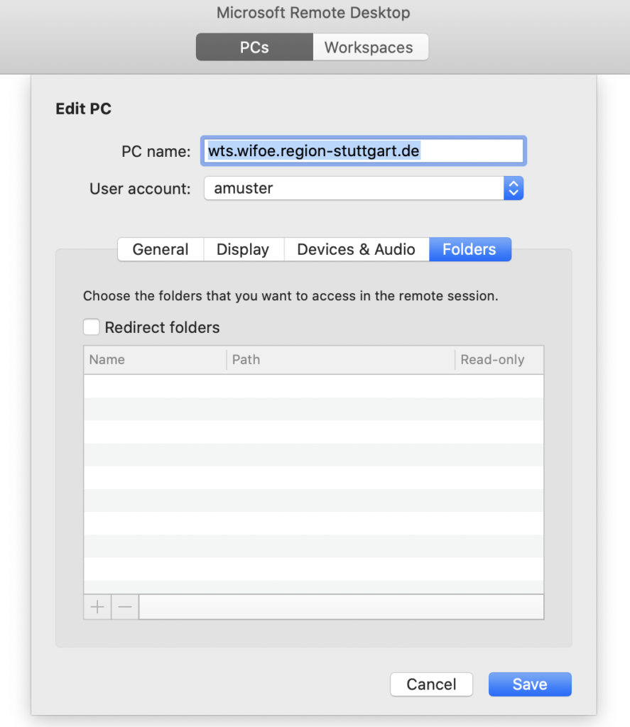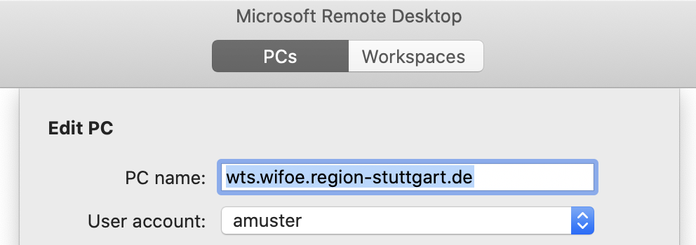 - Nachdem du deinen Account hinzugefügt hast, gebe als PC name folgendes ein: BROKER02.WIFOE.REGION-STUTTGART.DE (Achtung, die alte Adresse „wts.wifoe.region-stuttgart.de“ ist ab dem 30. Oktober 2021 nicht mehr verfügbar) und wähle deinen erstellten User account aus