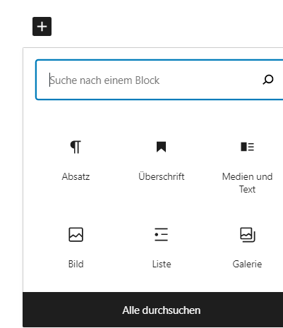 Startest du einen neuen Absatz, findest du auf der rechten Seite ein weißes Plus vor schwarzem Hintergrund. Klicke darauf, um z.B. eine Überschrift, ein Bild oder eine Liste hinzuzufügen. Wählst du „Alle durchsuchen“, findest du alle Möglichkeiten.