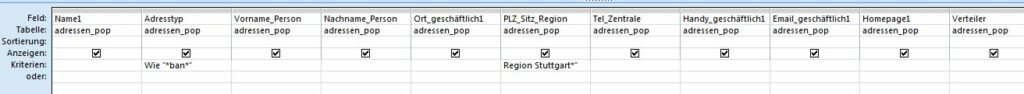 bedeutet, dass alle Datensätze, die das Wort „*_______*“ in dem angegebenen Feld enthalten, angezeigt werden. Trägt man z.B. „*Region Stuttgart*“ unter PLZ_Sitz_Region“ ein, erhält man alle Adressen aus der Region Stuttgart.