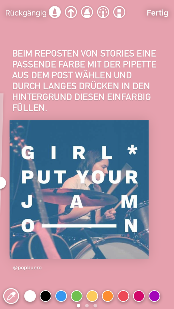 Wenn du eine Storys teilst, findest du oben rechts in der Auswahlleiste eine gewellte Linie. Klicke darauf. Nun hast du unten links eine Pipette (siehe Foto). Wähle eine passende Farbe aus dem Bild und klicke lange auf den Hintergrund. Nun passt der Hintergrund farblich zum Motiv.